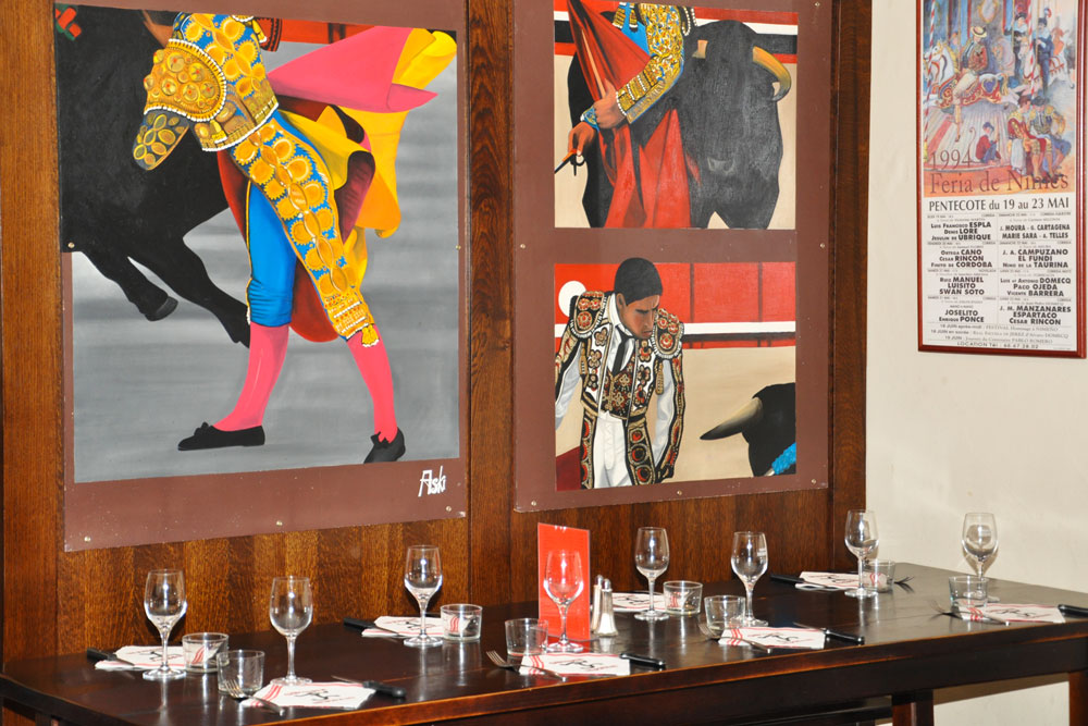 Mais avant de prendre place à ces tables disposées toutes en long, passez donc au bar déguster la sublime sangria Hernani accompagnée de véritables tapas ( piquillos farcis à la morue, chipiron plancha, crevettes,etc…). Un diner au rythme typiquement ibérique, tenue décontractée, sourire obligatoire, soirée réussie qui vous transportera directement en espagne.